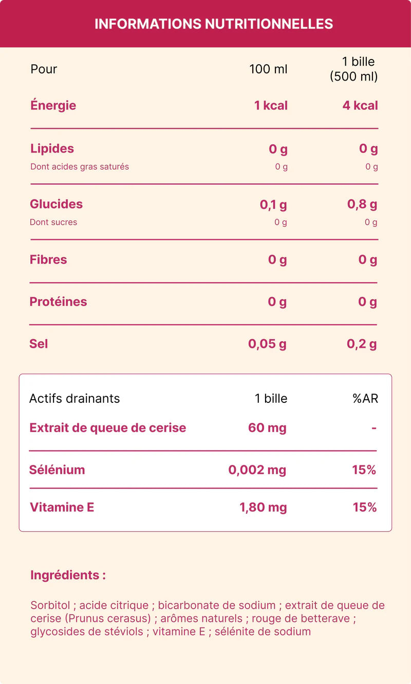 Ingrédients : sorbitol, acide citrique, bicarbonate de sodium, extrait de queue de cerise, arômes naturels, rouge de betterave, glycosides de stéviols, vitamine E, sélénite de sodium.